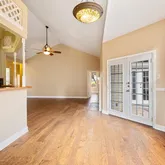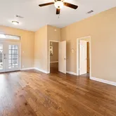 - Room Description: The abundantly lit large primary bedroom features a tall ceiling, wooden blinds, and access to the backyard via French doors.