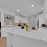 - Room Description: Stunning gourmet kitchen on the main level featuring quartz counters, high ceilings, recessed lighting that enhance the light and open feel. Designed for both everyday living and entertaining, the kitchen flows seamlessly into the family room, connects beautifully to the backyard, effortless indoor outdoor living. The space offers a spacious breakfast bar, dedicated eat in dining area, abundant cabinetry, and generous pantry. An exceptional kitchen that combines style, comfort, & functionality.