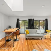 with the quiet grace of the Hudson Valley. Thoughtfully reimagined and renovated, the property offers both comfort and space to spread out. Upstairs, an airy two-bedroom, one-bath retreat, bright with natural light from skylights and