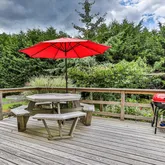 The deck off of the dining room leads to a private backyard full of beautiful trees, and gardens plus a large shed
