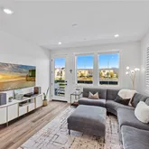 Upstairs, the open-concept great room welcomes you with abundant natural light and mountain views. The chef-inspired custom kitchen features an extended kitchen island with waterfall edge, Café appliances, custom cabinetry with pullouts, single basin sink, custom hardware, upgraded backsplash, and LED lighting. A French door opens to your private patio, perfect for alfresco dining while soaking in Rancho Mission Viejo’s breathtaking vistas.