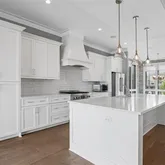 - Kitchen Features: Cabinets White, Kitchen Island, Pantry, View to Family Room, Solid Surface Counters