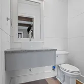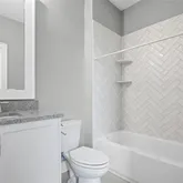 The gourmet kitchen features quartz countertops, a large island that seats four, stainless steel appliances, and a gas range—perfect for cooking and entertaining. With three levels of living, the floor plan offers exceptional flexibility and flow. The lower level includes one bedroom and one full bath, ideal for guests, an office, or an in-law suite. The main level showcases bright open-concept living and dining areas with a powder room, and two balconies—one facing the front and another off the living room overlooking the back. Upstairs, you’ll find two spacious bedrooms, each with its own en suite bath for added comfort and privacy.