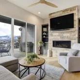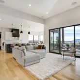 great room showcases expansive views of Pikes Peak with a stacking slider that opens to covered patios, creating an ideal