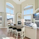- Room Description: 20 foot ceiling, ceiling fan, gas tiled fireplace, walls of windows with open space views