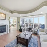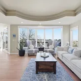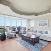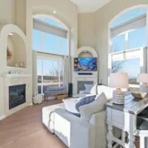 - Room Description: Formal Living Room with tray ceiling, gas tiled fireplace and large bow window with open space views