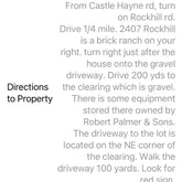 - Directions: From Castle Hayne rd, turn on Rockhill rd. Drive 1/4 mile. 2407 Rockhill is a brick ranch on your right. turn right just after the house onto the gravel driveway. Drive 200 yds to the clearing which is gravel. There is some equipment stored there owned by Robert Palmer & Sons. The driveway to the lot is located on the NE corner of the clearing. Walk the driveway 100 yards. Look for red sign.