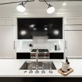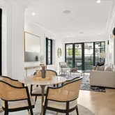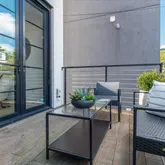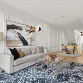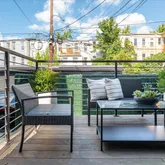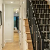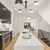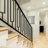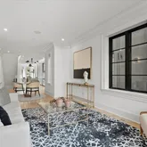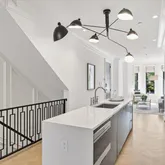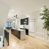 Upon entering, the home immediately captivates with its striking white oak herringbone floors that flow seamlessly throughout, setting the tone for a space where elegance meets functionality. Custom-designed wrought iron railings add a touch of artistry to the open staircase, guiding you through a layout that balances openness with intimacy. The main level is highlighted by a dramatic dining room tucked within a turret, creating an elevated space for both entertaining and quiet reflection. A true chef’s kitchen, outfitted with sleek European cabinetry, top-tier Wolf six-burner range, and a panel-ready Sub-Zero refrigerator, invites culinary exploration. The striking quartz waterfall island serves as both a functional centerpiece and a sculptural statement. The expansive living room is bathed in light from floor-to-ceiling windows, with a seamless transition to the private terrace, ideal for enjoying a quiet evening or hosting guests. Thoughtfully placed wall moldings and a hidden powder room further elevate the home’s aesthetic, while soaring, voluminous ceilings throughout amplify the sense of space and light.