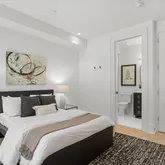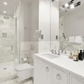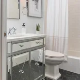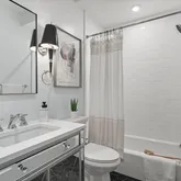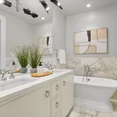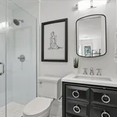 On the lower level, high ceilings continue to lend a sense of grandeur, where three generously sized bedrooms are accompanied by equally stunning baths. The primary suite is a sanctuary of serenity, featuring an ensuite Zen-inspired bath complete with a freestanding soaking tub that commands attention. The spa-like experience continues with dual sinks, heated marble floors, and a separate shower. The second bedroom is equally luxurious, with its own ensuite bath boasting glamorous finishes, while the third bedroom shares a hall bath adorned with a mirrored vanity—a nod to modern opulence. A washer and dryer conveniently located on the bedroom level enhance the home's functionality.