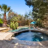 Outdoor living is equally impressive. A covered deck and covered balcony capture beautiful Hill Country views, overlooking a thoughtfully designed backyard anchored by a large deep pool with hot tub, waterfall features, and a built-in table with umbrella. A rare flat additional backyard space offers room to run, play sports, or host gatherings, while multiple patio and deck areas provide ideal settings for a fire pit, BBQ area, and outdoor dining or lounge spaces.