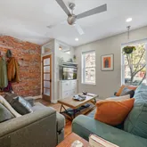The main living space is warm and inviting, with exposed brick, beautiful reclaimed wood floors, and an easy, open flow from front to back. Light comes in from both ends, and the space just works—whether it’s a quiet night in or having friends over.