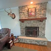 Living Room: Cozy wood-burning fireplace (sold as-is with no known defects—buyers should inspect flues and chimneys)