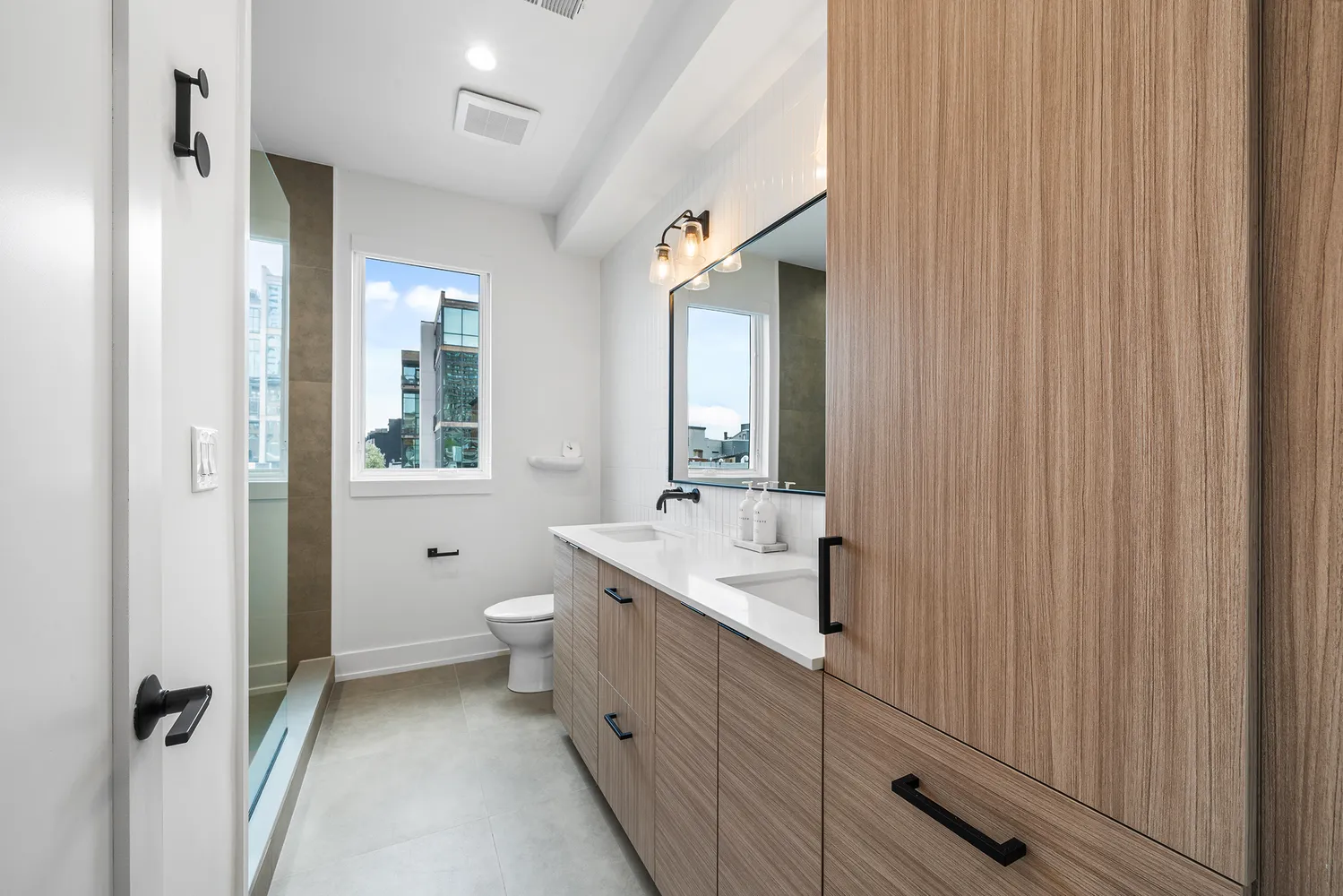 Third Floor: A tranquil primary suite greets with you with Moooi Random II Pendant Light, oversized windows, walk-in Custom California Closet in Luxe Dove, and custom automatic blinds with stunning views of the city. The spa-like bath includes a double vanity, soaking tub, and shower. Down the hall grab a drink from the built in wet bar beverage fridge and head to the Roof Deck with breathtaking 360 views of the city, enjoy evening cocktails or simply unwind after a long day.