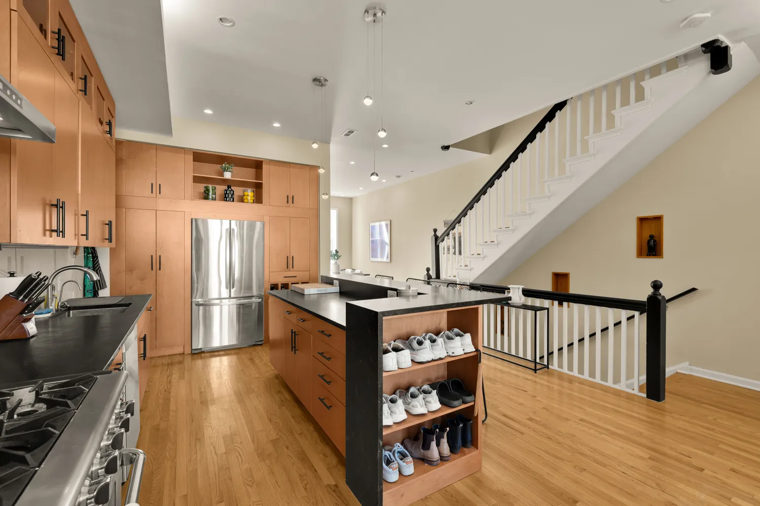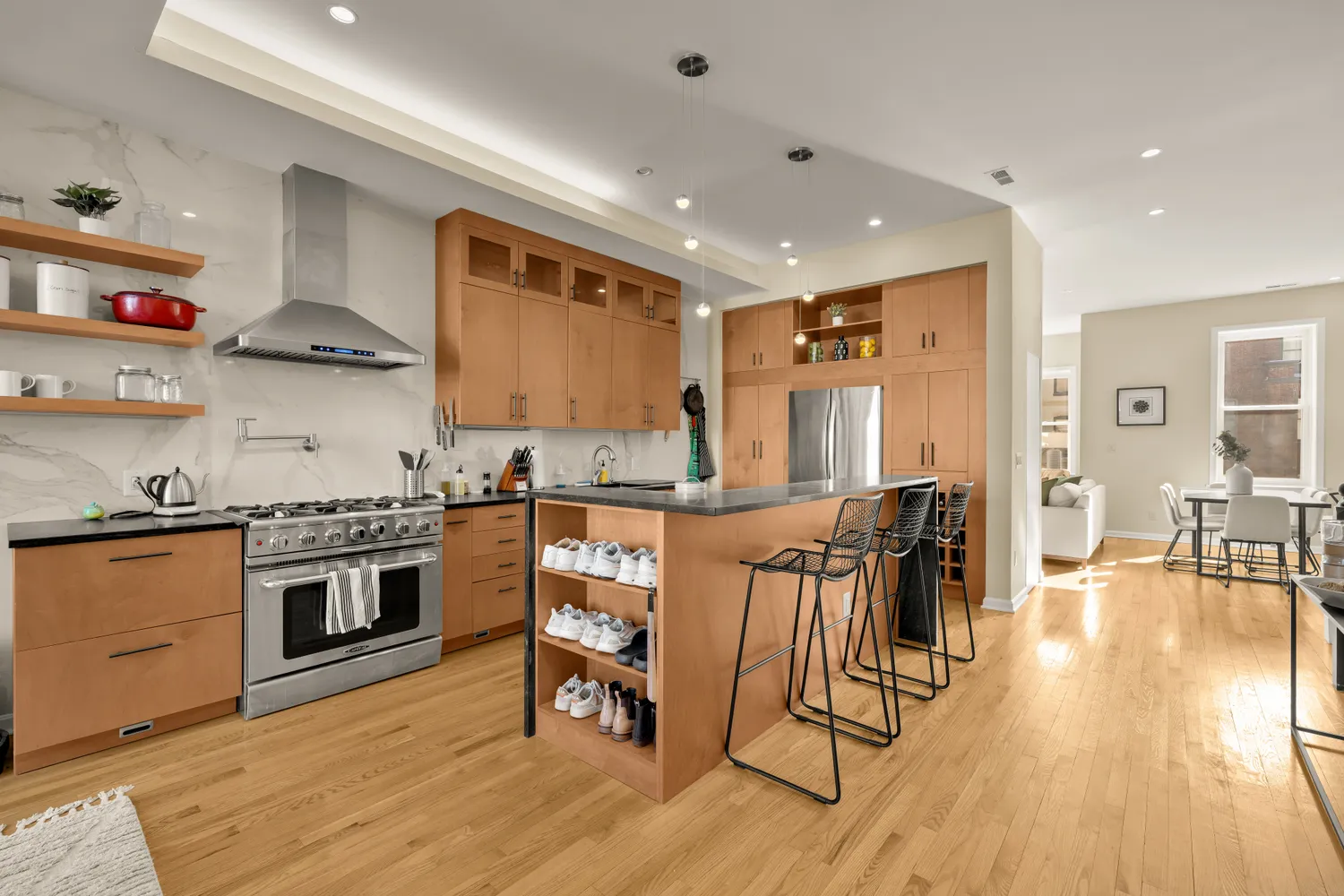 From the moment you enter, the scale and openness of the home make a striking impression. Soaring ceilings and oversized windows flood the main level with natural southern light, creating an airy, inviting atmosphere that is equally suited to everyday living and elegant entertaining. The home opens into a true chef’s kitchen, thoughtfully designed with cherry cabinetry and extensive built-ins, granite countertops, and a professional-grade six-burner range with pot filler and exterior-vented hood. Every detail has been considered, from pull-out spice storage and baking sheet drawers to a wine rack and microwave drawer, making this kitchen as functional as it is beautiful.
