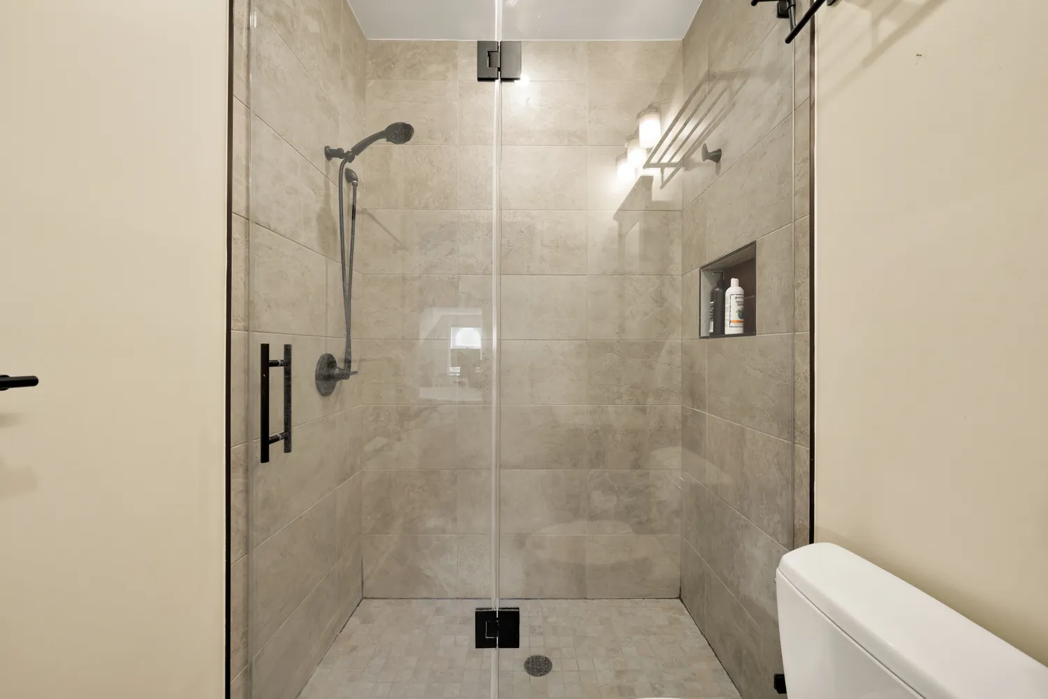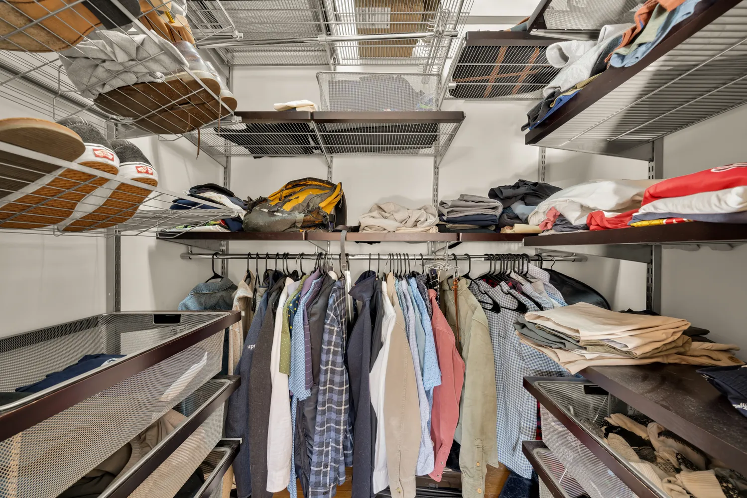 Upstairs, the private quarters feel like a peaceful retreat. The primary suite is truly expansive, offering room for a king-size bed, seating area, and workspace, along with a walk-in closet with ELFA shelving, a wall of custom built-ins, and additional file storage tucked beneath a charming garret window. The ensuite bath enhances the sense of comfort and privacy. The second bedroom is also impressive in scale, featuring large windows, built-in bookshelves and cabinetry, and immediate access to a full bath — making it ideal as a guest suite, home office, or secondary primary. A stacked washer and dryer is conveniently located between the bedrooms. With no residence above, the upper-level setting provides exceptional privacy and quiet.