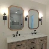 It's finished with a natural warm weathered wood vanity and wood framed mirrors embraced by black wall sconces. The spacious walk in shower includes a high mounted rain water shower head, hex mosaic linear tile drain, and oversized hex mosaic niche. And it's all encased in custom frameless glass.
