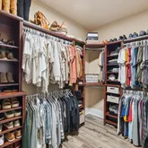The primary suite serves as a true retreat, complete with dual vanities, a tiled walk-in shower extending to the ceiling, a soaking tub, and a custom walk-in closet. The secondary bedrooms are well-appointed, generous in size, and include spacious closets, offering flexibility for family, guests, or hobbies.