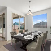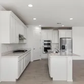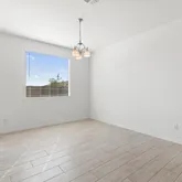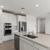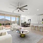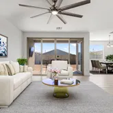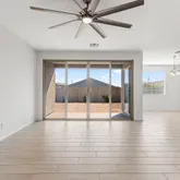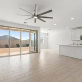 The kitchen anchors the home with a large island, quartz countertops, and stainless steel appliances including a gas cooktop, built-in wall oven, microwave, vent hood, dishwasher, and refrigerator. It opens seamlessly to the dining and living spaces, ideal...Built in 2022, this upgraded 4 bedroom, 2.5 bath single level home offers modern design and effortless living. Expanded tile flooring runs through the main areas, with natural light streaming in through impressive multi-panel sliding glass doors.