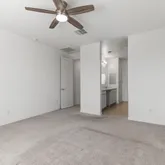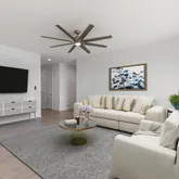 The kitchen anchors the home with a large island, quartz countertops, and stainless steel appliances including a gas cooktop, built-in wall oven, microwave, vent hood, dishwasher, and refrigerator. It opens seamlessly to the dining and living spaces, ideal for entertaining. The primary suite features a tiled shower with glass enclosure, dual quartz vanities, and a walk-in closet. Ceiling fans throughout add comfort and efficiency.