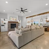 Inside, you’ll find a warm and inviting living area featuring a gas-burning brick fireplace, custom built-ins, and beautiful shiplap accents throughout. The open-concept kitchen is a true showstopper with farmhouse-inspired design, custom cabinetry, under-cabinet lighting, a gas stove, walk-in pantry with built-ins, and the refrigerator included — making this home truly move-in ready.