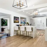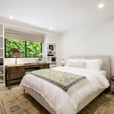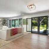 Three spacious bedrooms and two and a half baths are complemented by soaring ceilings, wide-plank French oak floors, and walls of glass that invite natural light throughout. The Chef's kitchen showcases impeccable craftsmanship and seamlessly integrates into the open living spaces.