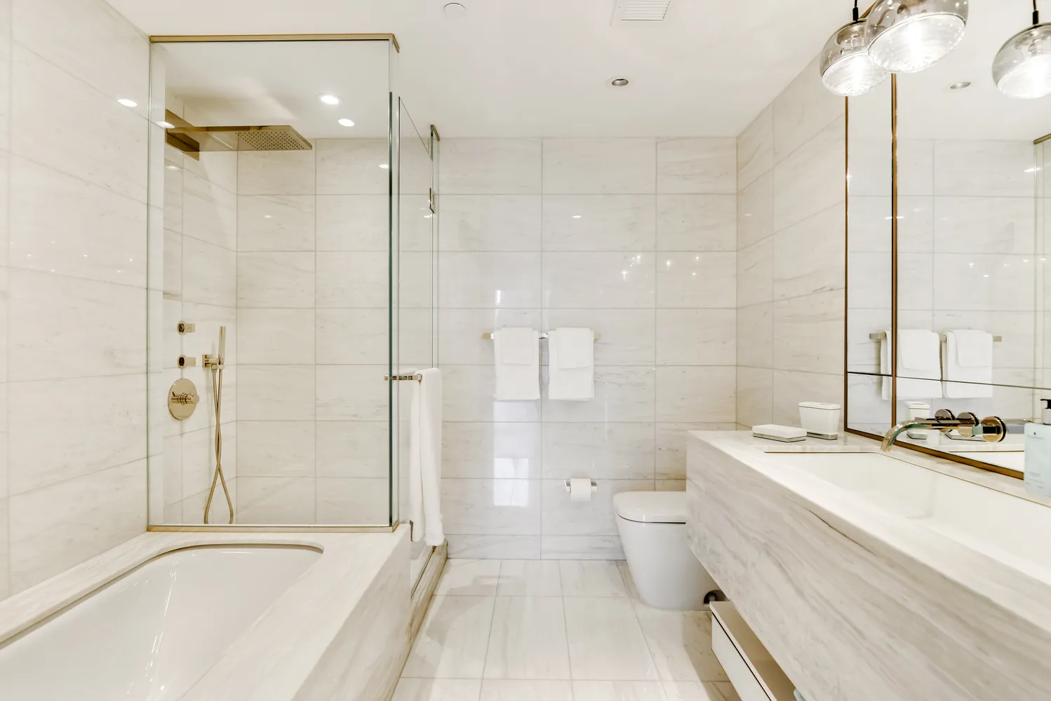 The luxurious Primary Suite is filled with light from a wall of south-facing floor to ceiling windows, and affords ample space for any wardrobe with multiple custom-fitted closets. The ensuite primary bath, accessed through custom Rimadesio white glass pocket doors, has radiant-heated Siberian White marble flooring, a custom vanity topped with Siberian Mink stone, imported Italian Fantini fittings and fixtures, a large soaking tub, and a separate walk-in shower with dual rainfall and handheld shower heads. The second bedroom is also generously proportioned, with south-facing exposures and beautiful natural light. A second full bathroom and in-unit Miele washer and dryer complete this well-appointed home.