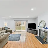 You’re welcomed by a spacious foyer with a coat closet and convenient powder room. The main living and dining area is bright and open with hardwood floors, a cozy wood-burning fireplace, and sliding glass doors that lead out to a private patio with access to both the rear and side yards—perfect for relaxing or entertaining.