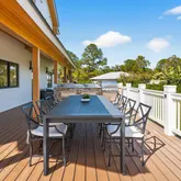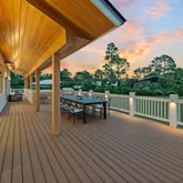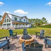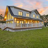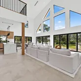 appliances and opens to a dramatic living space anchored by a striking two-story A-frame window that floods the home with natural light and creates a strong connection to the outdoors. Designed for both everyday living and entertaining, the home includes smart lighting by 'Lutron Caseta', dual laundry area, and a climate-controlled garage converted into a playroom with a bar, kegerator, and side-by-side refrigerator. Outdoors, an expansive 1,800-square-foot wraparound covered porch with cypress wood accents and a summer kitchen provides the ideal setting for year-round entertaining. The builder offers customization for a future pool and outdoor living area, allowing buyers to tailor the design to their dream vision. Built for longevity and peace of mind, the home features elevated slab construction, hurricane-impact windows and doors, a titanium roof with double wrap trusses, spray-in insulation for energy efficiency, and a 26kW 'Generac' standby generator with 400-
