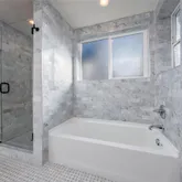 - Room Description: Bright marble tile 5 piece bath with dual sinks, a bathtub and oversized shower.