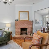 Inside, original details, hardwood floors, and gracious proportions create inviting living spaces. The living room with fireplace flows into the dining room, while the table-space kitchen opens to a screened porch overlooking a private flagstone patio, garden, and off-street parking.