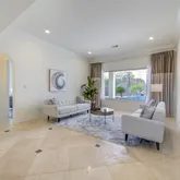 The home features wood floors throughout, custom Benedettini cabinetry, and a built in refrigerator in the thoughtfully designed kitchen. The outdoor space is an entertainer’s dream with palm trees, a sparkling pool and spa, and ample space for large family gatherings while enjoying the serene setting.