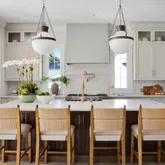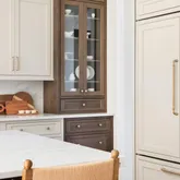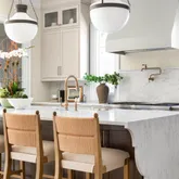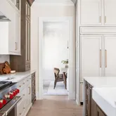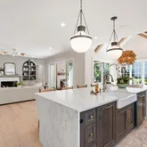 Inside, a bright open-concept design connects the family room, breakfast area, and gourmet kitchen featuring two-toned, ceiling-height cabinetry; a bespoke hood over a Wolf gas range; paneled Sub-Zero refrigerator; and Calacatta Apuano quartz countertops with sculptural curved island edge. The adjacent pantry and mudroom provide everyday storage while maintaining seamless flow to the oversized garage with built-in work space.