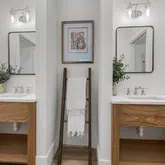 Two well-appointed bedrooms are situated on one wing of the home, sharing a beautifully designed Jack-and-Jill bath with white oak vanities and tasteful tilework. The grand primary suite is intentionally positioned on the opposite side for ultimate privacy. A striking brick-floored hallway leads to a spacious laundry room with oversized wash sink and a conveniently placed half bath.