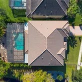 family room—ideal for entertaining. There are 2 Primary bedrooms, one on the upper floor and the other on the mail level. The primary suite offers a peaceful retreat with a spa-inspired bath and a walk-in closet. There are 2 bedrooms on the main level. All bedrooms have walk in Closets! All the bedrooms are large with walk in closets. Step outside to your private backyard oasis, complete with a covered lanai and sparkling