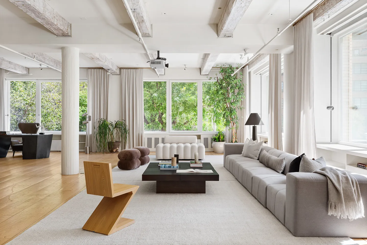 With 11’ original wood-beamed ceilings and fluted plaster columns, the corner living room is one of the single most impressive living rooms in...Available Furnished or Unfurnished. Minimum 6 month lease term.