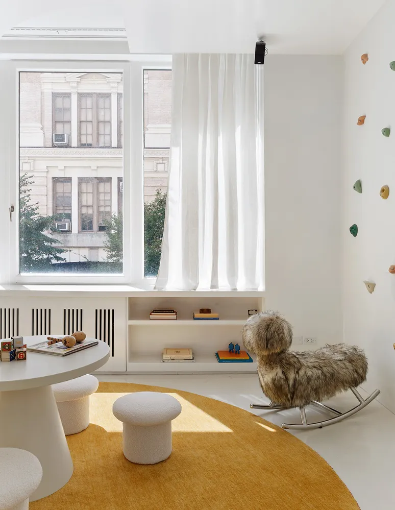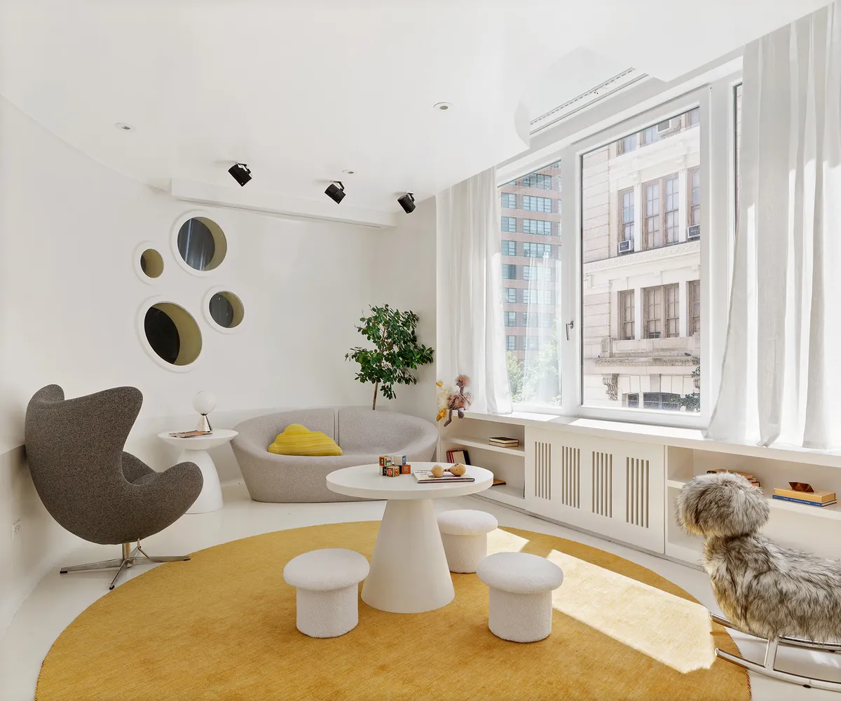 Set on the opposite side of the 52’ x 50’ living room for maximum privacy is the guest wing of the apartment, the highlight of which is a contemporary Venetian plastered, sci-fi bubble room. The layout of the wing features two true bedrooms, two interior rooms, and two and a half bathrooms.