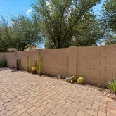 1) complete patio landscaping with multi colored paving stones, desert plants