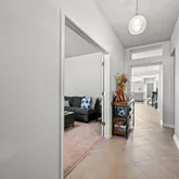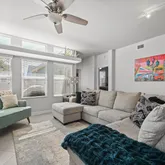 - Room Description: Sunlit and spacious living area wrapped in windows that bathe the home in natural light with transom windows above; Refreshing tile floors run throughout the living room, dining area, kitchen, and hallways