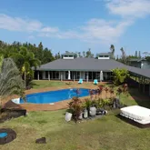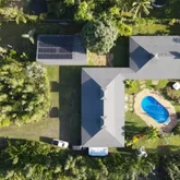 Welcome to your private sanctuary—this stunning, fully fenced one-acre estate near the ocean blends luxury, sustainability, and thoughtful design in one extraordinary package. The sellers lovingly refer to it as “Their Sanctuary,” and once you visit, you’ll see why. Crafted in a custom Balinese-inspired design, this self-contained home features 2,680 sqft. under roof, with over 3,000 sqft. of covered lanais, on one level. The detached four-car garage adds another 1,056 sqft. Step inside to an expansive open floor plan that feels light, airy, and inviting. The home boasts 10’ walls, dramatic 16’ open beam ceilings with cupolas, and ceiling fans throughout. Massive sliding glass doors open seamlessly to the pool and spa, creating a natural flow between indoor comfort and outdoor living. This is island living at its best. The kitchen includes: