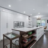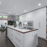 - RoomDescription 1: Eat in kitchen with bay window, center island, built-in refrigerator, cooktop, oven/range, modern look, and open flow to other rooms.
