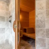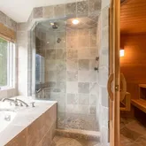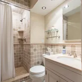 • Room Description: Travertine tile, shower