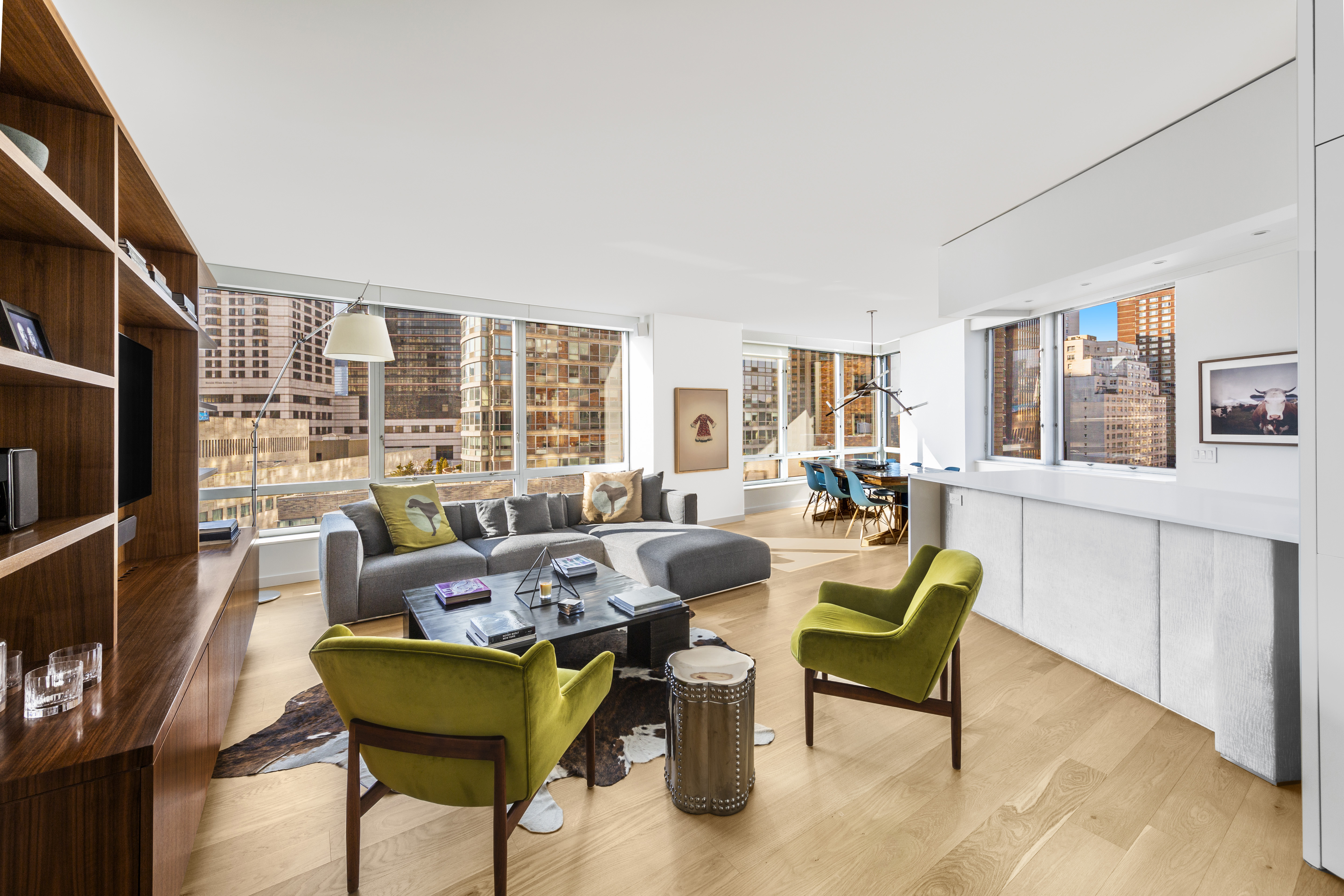 The oversized great room has walls of glass with expansive views West and North, custom built-in storage, and a bespoke wall unit. The open dining area features corner views from 2 glass walls and easily accommodates dining for 8 or more.