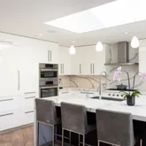 - Kitchen: 220 Volt Outlet, Cooktop - Gas, Countertop - Quartz, Dishwasher, Freezer, Garbage Disposal, Island with Sink, Microwave, Oven - Double, Oven - Electric, Oven Range - Built-In, Refrigerator, Skylight, Wine Refrigerator