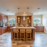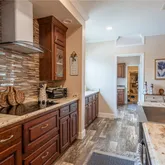 - Light-Filled Living Spaces: Enjoy the large living room featuring an inset for a big-screen TV, canned lighting, a wood burning fire place with stunning masonry accents and side shelving for your decor. Key Features: