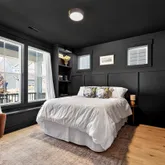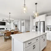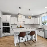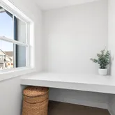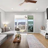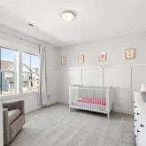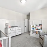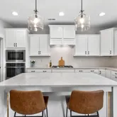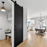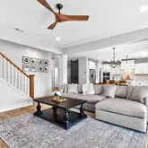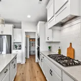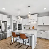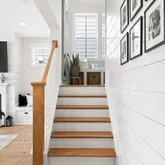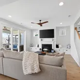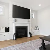 Inside, curated details elevate every space. The gourmet kitchen features quartz countertops, a large center island, custom pantry shelving, a coffee bar nook, high-end appliances, and soft-close cabinetry. The family room centers around a shiplap-wrapped gas fireplace with built-in storage, while custom millwork, board-and-batten accents, and open oak-tread stairs create warmth and architectural character throughout the home.