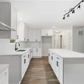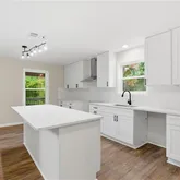 - Kitchen Features: Cabinets White, Kitchen Island, Stone Counters, View to Family Room