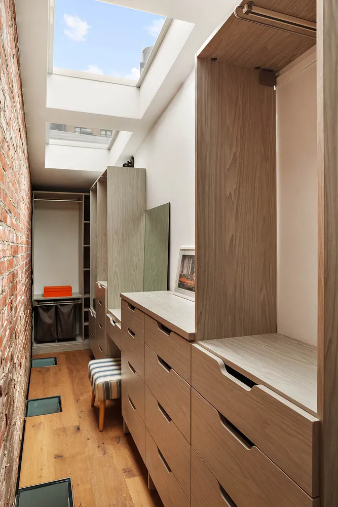 Enter the exposed brick hallway with lighted skylights to reach this dramatic and sunblasted main floor, double-height dining space with wood burning fireplace. The living area has large windows, wired speakers and three large storage spaces in the ceiling. The fully renovated, windowed kitchen has Liebherr refrigerator, Miele integrated dishwasher, Haier microwave and Smeg gas range. Ascend the modern staircase to the sleeping area with a sliding partition overlooking the main living space. The large walk-in closet has impressive built-ins and three skylights with retractable shades. There is also the possibility of enclosing to living room to create a second bedroom.