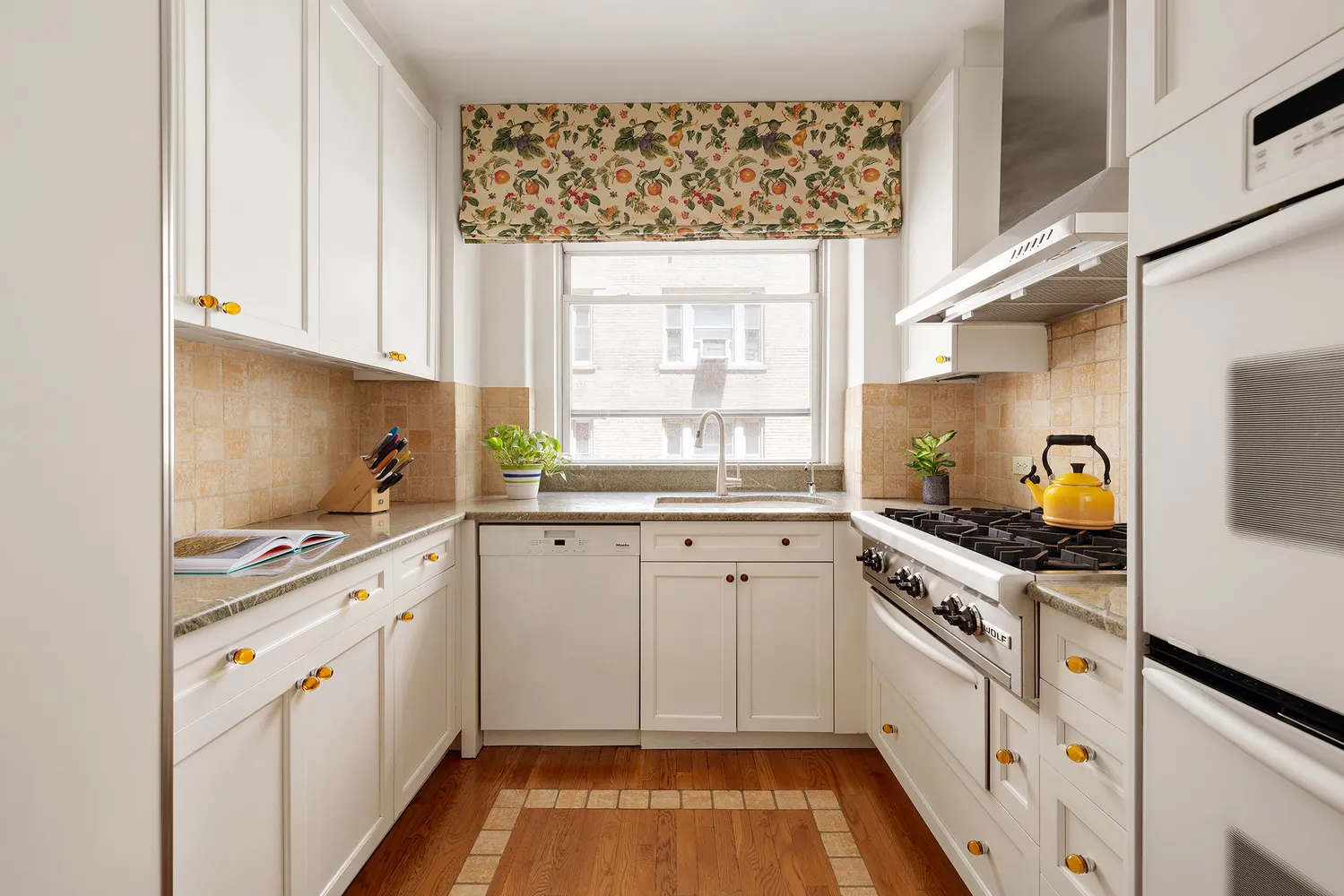 The windowed, eat-in kitchen is both stylish and functional, complete with a handsome bar area and wine refrigerator, large pantry, charming built-in banquette for casual dining, and a custom desk nook.