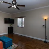 ceilings, ceiling fan and adjoining bath with jetted tub,...Fabulous opportunity on this beautifully updated end unit - one of the best in the complex! Living room features rich wood floors, crown molding, upgraded baseboard trim & Peak view. The kitchen has been updated w/ hickory cabinets, granite counters and high-end Bosch &