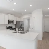The primary suite offers vaulted ceilings and cozy...Well-maintained one-story, pet-friendly home in the Waterstone subdivision of Kyle, Texas, offering 3 bedrooms and 2 full bathrooms with a functional and comfortable layout. The kitchen and living areas feature easy-to-care-for laminate flooring, while the open kitchen is appointed with white cabinetry, subway tile backsplash, quartz countertops, stainless steel appliances, and a convenient breakfast bar—ideal for everyday living and casual dining.